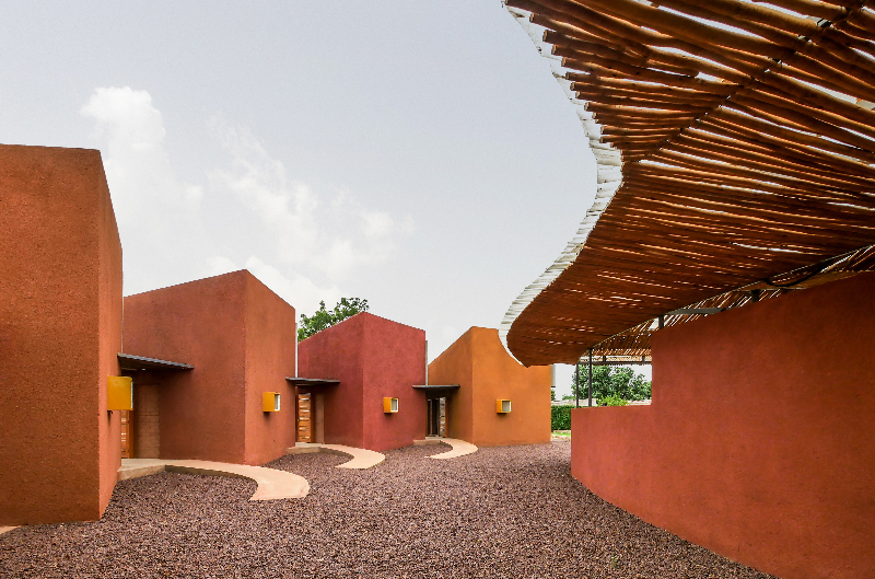 The Startup Lions Campus built in 2021 in Turkana, Kenya, uses local quarry stone and stacked towers for passive cooling to minimize the air conditioning needed to protect technology equipment. Burkina Institute of Technology is composed of cooling clay walls cast in-situ to accelerate the building process. Overhanging eucalyptus, which provide minimal shade and deplete soil nutrients, were repurposed to line the angled corrugated metal roofs, which protect the building during the country’s brief rainy reason, and rainwater is collected underground to irrigate mango plantations on the premises.