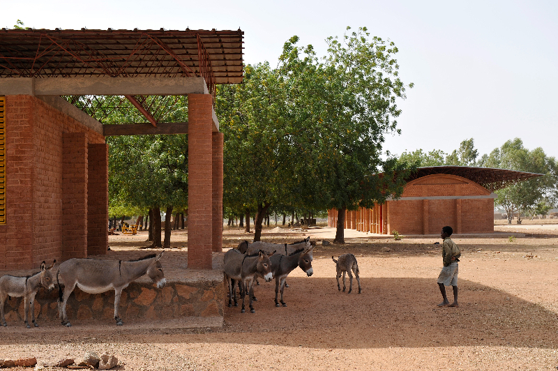 The concrete roof of Gando Primary School Library was poured around a grid of traditional clay pots that left openings for natural light allowing heat to escape. A facade of eucalyptus wood surrounds the elliptical building, creating flexible outdoor spaces that emit light vertically. Benga Riverside School built in Tete, Mozambique in 2018 features walls patterned with small recurring voids, allowing light and transparency to evoke feelings of trust from its students. The walls of Centre for Health and Social Welfare built in Laongo in 2014 have a pattern of framed windows at various heights to allow views of the landscape for everyone, from a standing doctor to a sitting visitor to a lying patient.