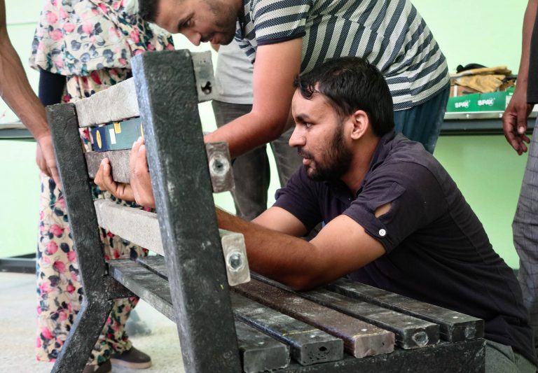 Working with a Precious Plastic team, the refugees set up the recycling workshop in just three weeks. After installing the machines, they learned to identify and sort the different kinds of plastic, shred it and use the sheet press to melt the assorted plastic scraps into sturdy beams or large sheets which can then be used to make just about anything.