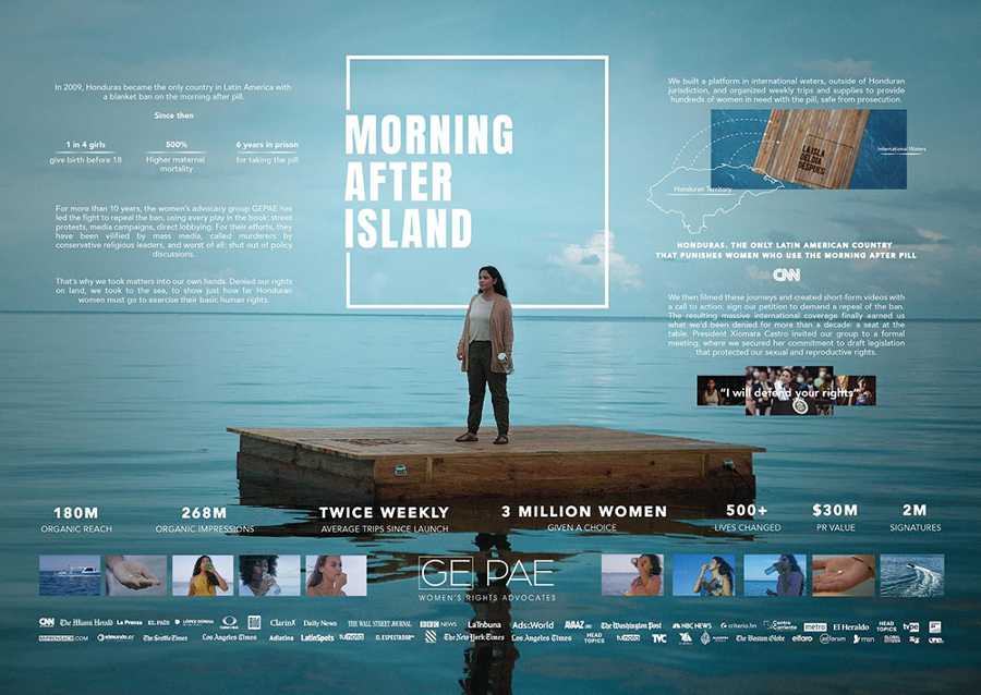 “The journey [to develop the campaign] began by knocking on the doors of several governmental and diplomatic offices, one-on-one lobbying with stakeholders, and meetings with GPAE allies,” creative director Cesar Chinchilla told Little Black Book in 2022, after returning from Cannes with some of advertising’s highest awards for the Morning After Island campaign.