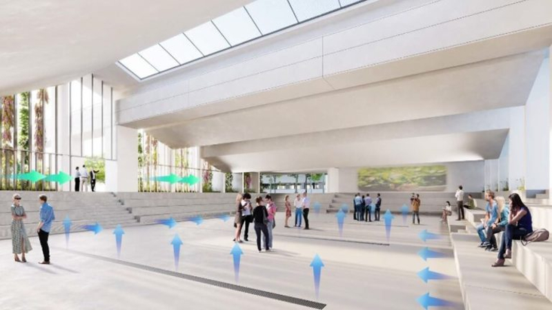 The two auditoriums, green spaces, a promenade and a shaded area with benches are cooled with cool air pumped through small openings in the floor and steps by solar-powered fans. A channel with water goes 20 meters deep underground and, through air vents, drives the coolness of the water upwards. Below the ground, the water temperature drops 10 to 15 degrees, and above it results in a drop of 6 to 7.