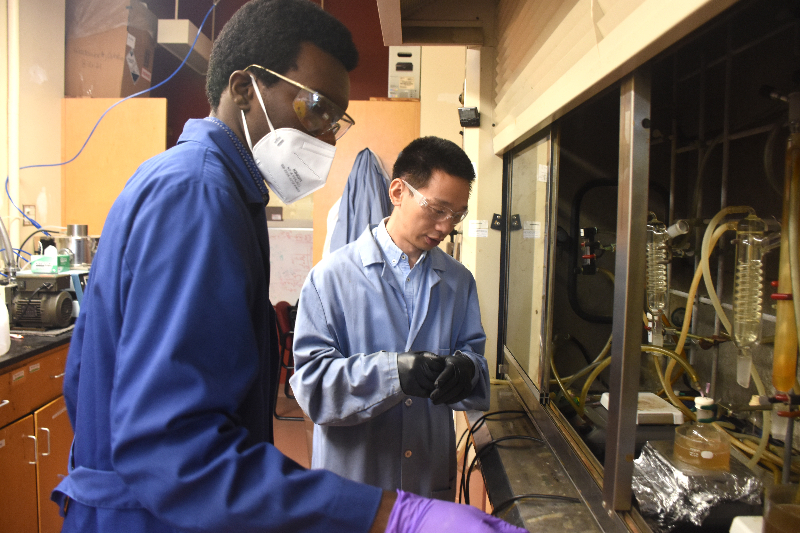 (From left) Eric Munyaneza and Guoliang “Greg” Liu prepare plastic materials to upcycled into a fatty acid liquid in Liu’s lab at Hahn Hall South. Munyaneza is also an author on the Science journal study. Photo by Steven Mackay for Virginia Tech.