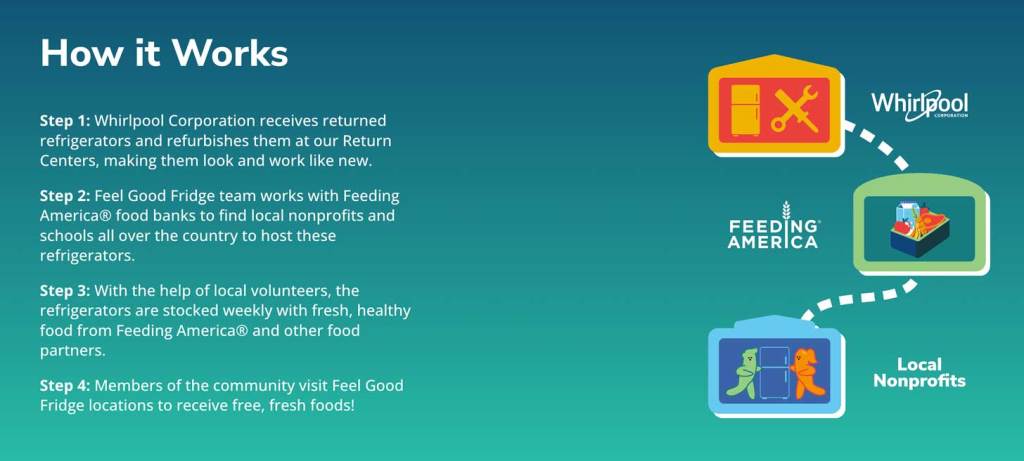 Since 2021, Whirlpool has been refurbishing damaged or returned fridges and provided them to food banks and agencies that need to store perishable goods. Through its Feel Good Fridge program, it has donated more than 900 refurbished refrigerators and delivered more than 250,000 pounds of food to partner agencies, reaching more than 25,000 families.